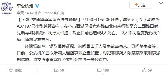 警方通报称,事发时,陈某某(女)驾驶浙A87T97号小型越野客车,在西湖区沿竞舟路由北向南行驶至文二西路口时,先后与4辆机动车及行人相撞,目前已造成4人死亡、13人不同程度受伤及车辆、道路设施损坏。