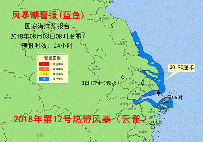 受今年第12号热带风暴“云雀”的影响,预计:8月3日白天,江苏盐城到杭州湾沿海将出现30到90厘米的风暴增水,上述岸段内的潮位站将不会出现达到当地蓝色警戒潮位的高潮位。风暴潮预警级别为蓝色。