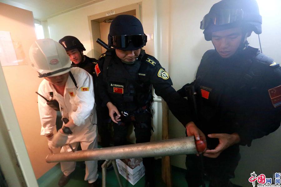 抵达商船后,特战队员们实地查看了“康耀”号商船船型结构、安全舱设置以及舱面铁丝网、高压水枪等反海盗设施,详细了解了船员自制的钛雷等反海盗器材的杀伤力,和船员进行了反海盗经验的交流。特战队员们根据实际情况,给商船提出了增加防护手段、完善预案内容等多项建议。