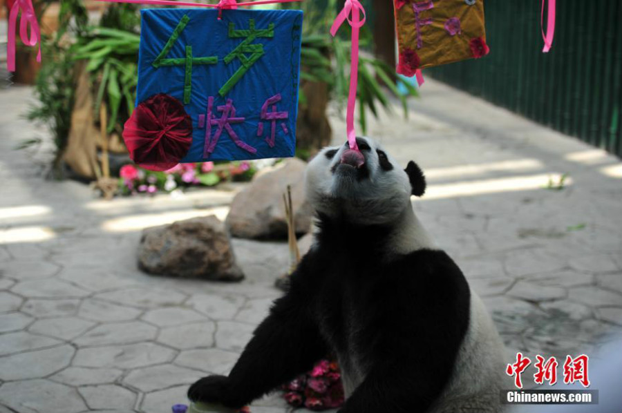 8月10日是大熊猫兄弟浦浦、发发的4周岁生日,沈阳森林动物园在熊猫馆为两兄弟举办生日会。图为发发在玩耍。 中新社记者 于海洋 摄