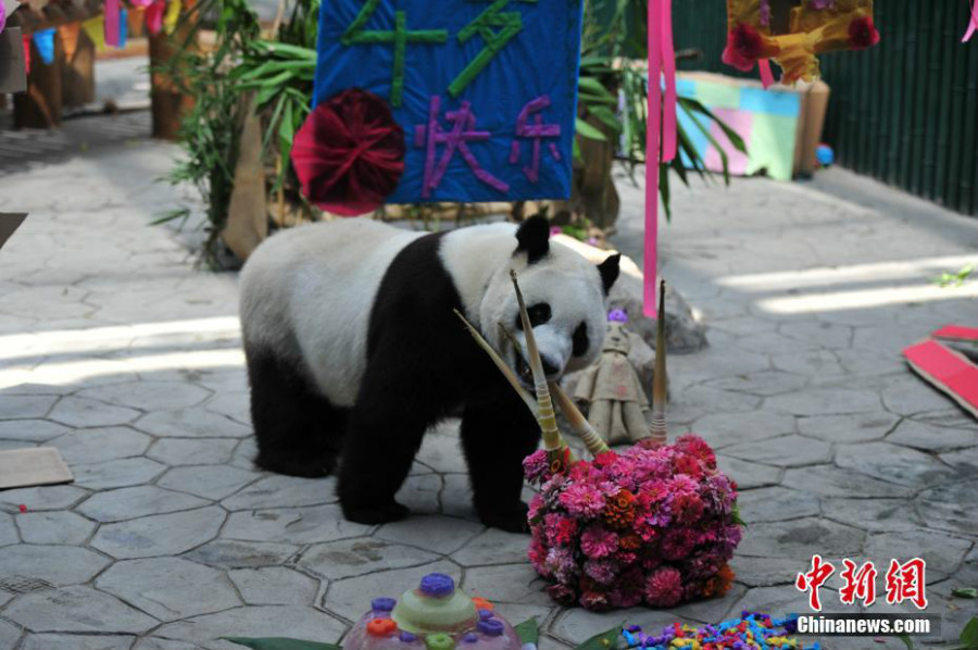 8月10日是大熊猫兄弟浦浦、发发的4周岁生日,沈阳森林动物园在熊猫馆为两兄弟举办生日会。图为发发在玩耍。 中新社记者 于海洋 摄