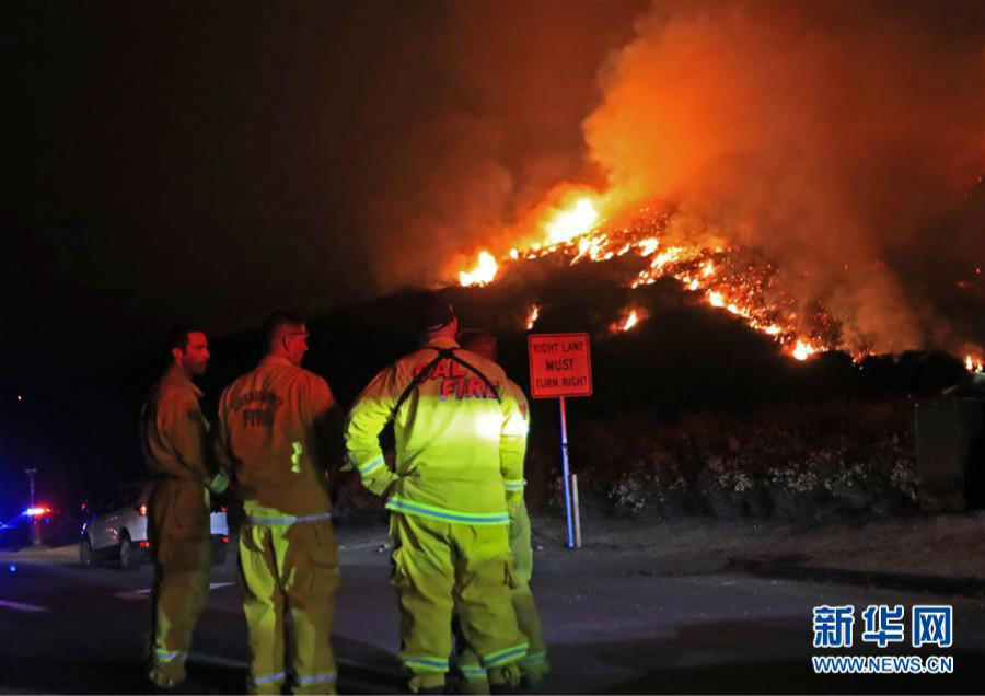 8月9日,在美国加利福尼亚州埃尔西诺湖地区,消防员观察火势。新华社记者 李颖 摄