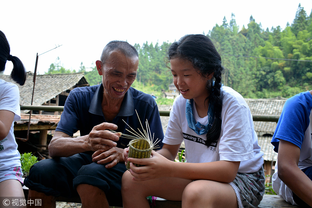 榕江县栽麻镇归柳侗寨,“学以成人乡土中国行研学营”小营员在学习竹编技艺。刘进银/视觉中国