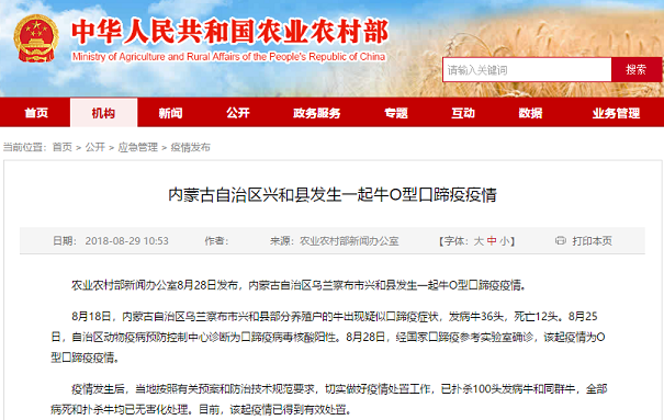 8月18日,内蒙古自治区乌兰察布市兴和县部分养殖户的牛出现疑似口蹄疫症状,发病牛36头,死亡12头。8月25日,自治区动物疫病预防控制中心诊断为口蹄疫病毒核酸阳性。8月28日,经国家口蹄疫参考实验室确诊,该起疫情为O型口蹄疫疫情。