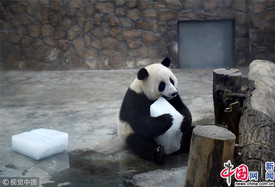 成都大熊猫繁育基地为大熊猫放置冰块解暑降温