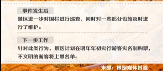 针对此类行为,景区计划在明年年初实行游客实名制购票,不文明的游客将上黑名单。