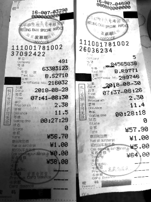 记者在小雨提供的发票中看到,她两天的乘车时间大约都是7时40分至8时30分,里程一个11.5公里一个11.4公里,等候时间一个为27分钟一个为28分钟,金额只相差1.2元,但8月29日的预约叫车服务费为0元,30日却是5元。