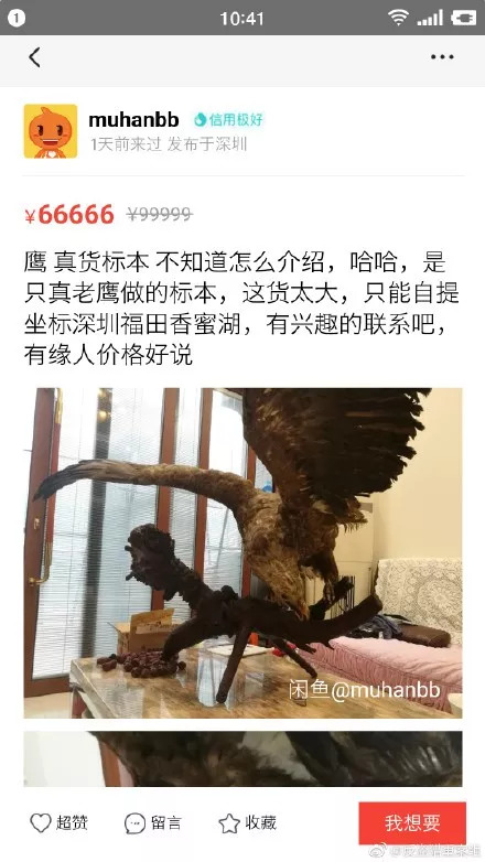 近日,一名网友在微博上发消息称,深圳福田有人通过“闲鱼”公开售卖大型猛禽标本。从网友提供的链接上看,卖家对待售物品的描述是“一只真老鹰做的标本”。