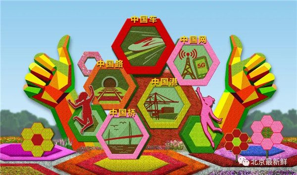 ▲东单西南角的“辉煌中国”主题花坛,通过重大工程的建设成就(中国桥、中国路、中国车、中国港、中国网),讴歌了伟大祖国从站起来、富起来到强起来的伟大飞跃,展现辉煌中国新时代新风貌。
