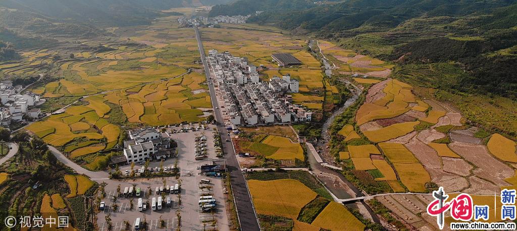 2018年9月14日,江西上饶,航拍婺源县江湾镇栗木坑村漫山遍野的稻谷金黄一片。眼下正值秋收季节,江西省婺源县农村各地稻谷成熟,村落与田野间呈现出一幅幅美丽的秋收画卷。王国红/视觉中国