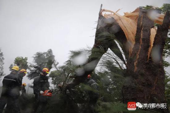 东莞东城交警大队执勤人员顶着狂风暴雨,清理路面障碍,消除交通安全隐患。