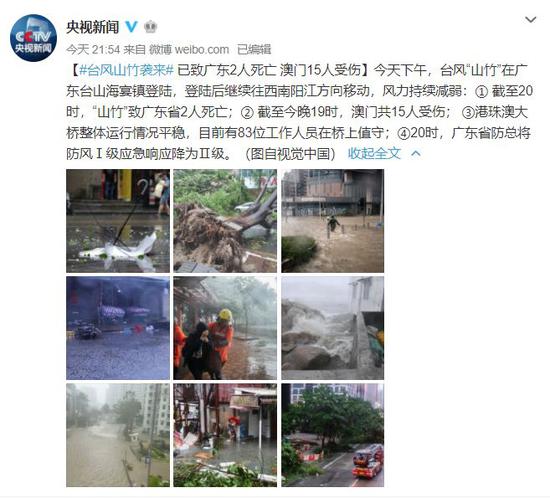 截至昨晚20时,台风“山竹”导致广东省2人死亡。截至昨晚19时,澳门共15人受伤。“山竹”至今已在香港造成超过200人受伤。