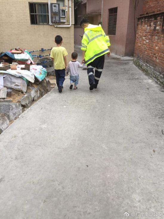 戴警官像一位大哥哥一样,牵着两个小朋友的手,一大两小的背影显得格外温馨。