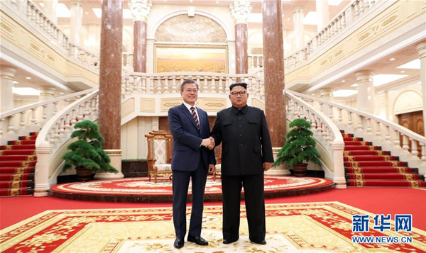 9月18日,朝鲜最高领导人金正恩(右)与韩国总统文在寅在平壤会晤。韩国总统文在寅18日抵达平壤,与朝鲜最高领导人金正恩举行双方今年之内第三次会晤。新华社发(韩朝首脑平壤会晤韩方联合采访团供图)