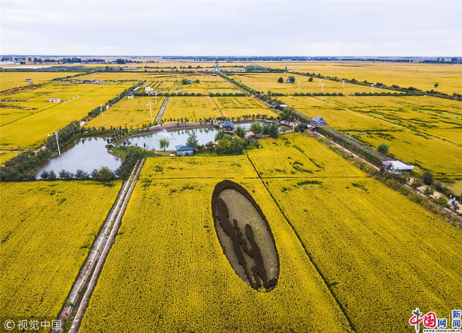 9月23日,沈阳,中秋假期,兴隆台锡伯族镇稻梦空间创意农业产业园的稻田画进入最佳观赏季,金灿灿的稻田一望无际。蔡靖宇/视觉中国