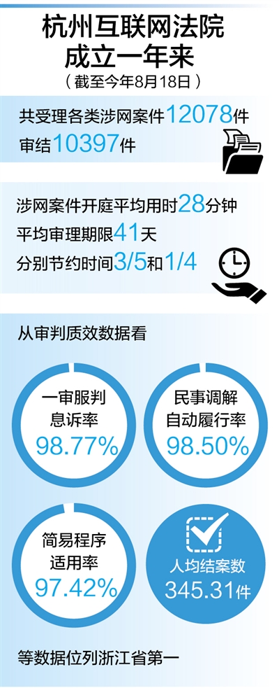 网上纠纷网上解,是设立互联网法院的初衷之一。记者了解到,杭州互联网法院发挥集中审理涉网案件的优势,截至今年8月20日,共受理涉网案件12122件,审结10441件;发布电子商务审判、知识产权保护等白皮书3份,连续4次发布十大典型案例,进一步强化了司法裁判的导向性作用。