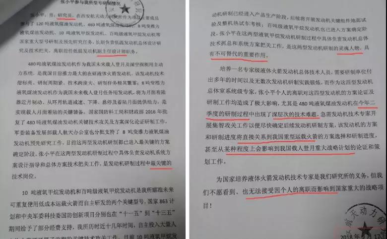 该公文提到,研究员、离职前任低温发动机副主任设计师职务的张小平,是未来载人登月和深空探测用的“两型发动机研制的灵魂人物”,“具有不可替代的重要作用”;作为四型发动机总体室系统级专家,张小平个人的离职对这四型发动机的方案论证及研制工作均造成了极大影响,“我们不愿、也无法接受因个人的离职而影响到国家重大战略项目!”