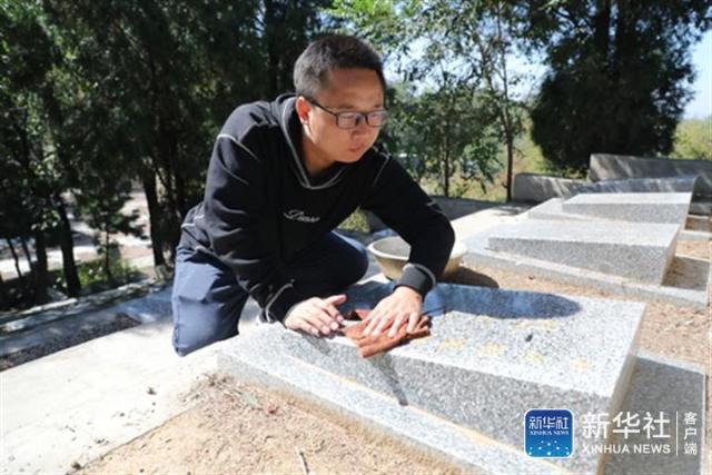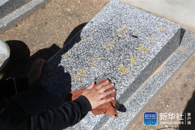 闫永杰在长城脚下的八达岭烈士陵园擦拭烈士墓碑(9月28日摄)。