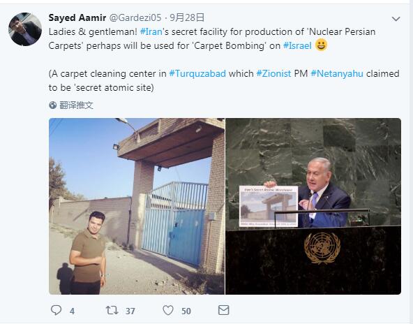 伊朗网友赛义德·阿米尔28日在推特上称:先生们,女士们!伊朗生产“核波斯地毯”的秘密设施,或许将被用于对以色列的“地毯轰炸”。他还配上了两张图。