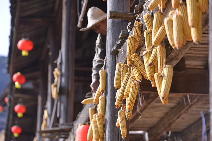 10月6日,福建省三明市尤溪县洋中镇桂峰村的村民在晾晒玉米。