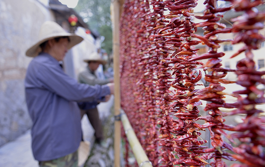 10月6日,福建省三明市尤溪县洋中镇桂峰村的村民晾晒辣椒。
