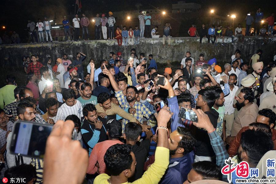 当地时间2018年10月19日,印度阿姆利则,当地发生一起火车撞人事件,造成至少50人死亡,大部分为妇女和儿童,另有多人受伤。据报道,一列火车冲入正在举行宗教庆祝活动的人群,当时人们聚集在铁轨上,因庆祝活动声音巨大,所以未听到火车的鸣笛。报道称,超过1000人参加了当天的宗教庆祝活动,死亡人数或将进一步上升。Prabhjot Gill/东方IC