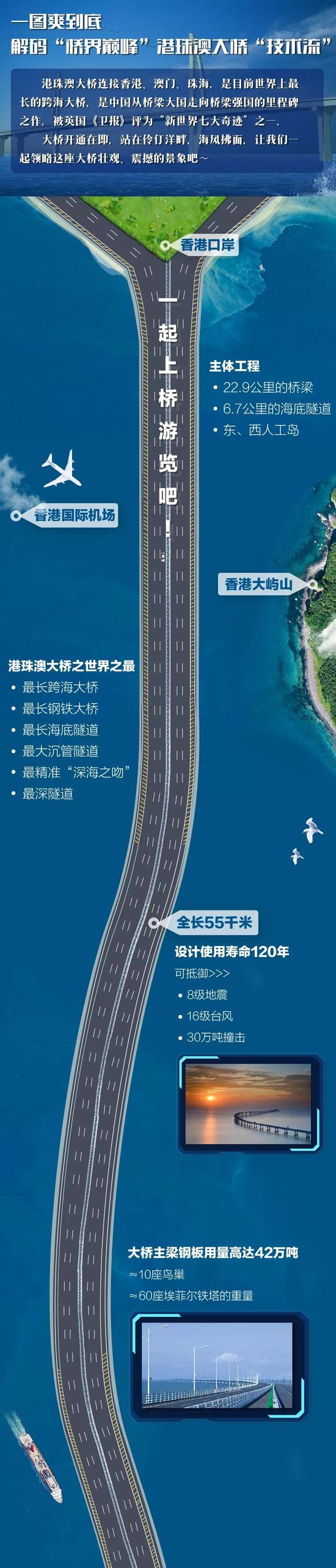 港珠澳大桥连接香港、澳门、珠海,是目前世界上最长的跨海大桥,是中国从桥梁大国走向桥梁强国的里程碑之作。大桥被英国《卫报》评为“新世界七大奇迹”之一。