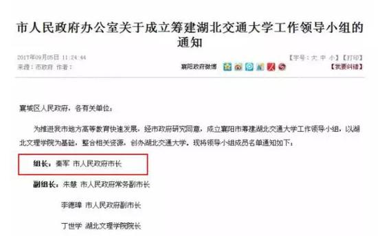 据报道,新创办的湖北交通大学将落户襄阳,在工作小组领导名单中,由时任襄阳市人民政府市长秦军担任组长。