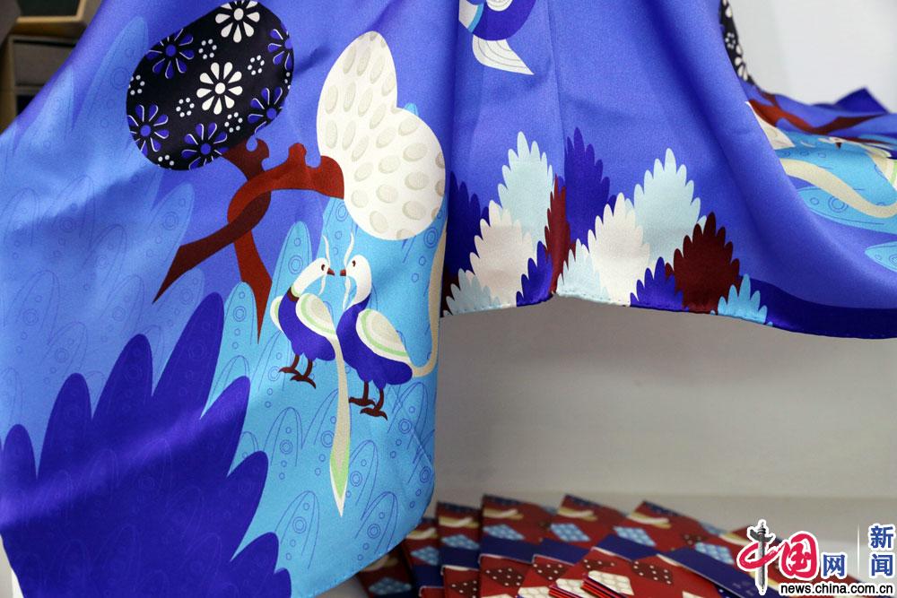 中国网北京10月25日讯(记者 罗琪)2018年,新疆龟兹研究院与童子文化传播(北京)有限责任公司合作,目前已开发制作了包括丝巾、帆布包、手机壳、红包、文件夹、花瓶等系列龟兹文创产品。图为丝巾上的莲花、卷草、菱格、花树、长尾鸟均取材自龟兹石窟壁画中的元素,构成了一副欢乐、自由、幸福、纯洁的美妙图景。中国网记者 刘迪 摄