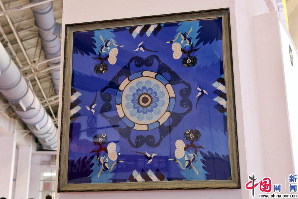 中国网北京10月25日讯(记者 罗琪)2018年,新疆龟兹研究院与童子文化传播(北京)有限责任公司合作,目前已开发制作了包括丝巾、帆布包、手机壳、红包、文件夹、花瓶等系列龟兹文创产品。图为一款以龟兹石窟壮丽的藻井图案为设计灵感来源的丝巾吸引了众人眼球。中国网记者 刘迪 摄