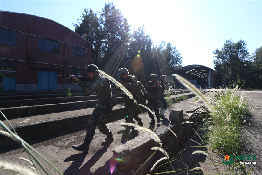 分队进行捕歼战斗演练,突击小组展开快速搜索。胡程 摄