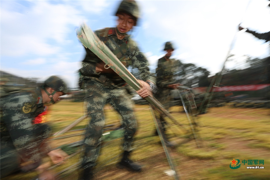 官兵快速展开宿营地搭建。胡程 摄
