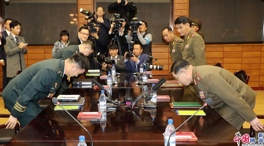 当地时间2018年10月26日,板门店,韩朝在板门店朝方一侧的“统一阁”举行第十次将军级军事会谈。这次会谈,韩朝代表团各由5人组成,韩国国防部对朝政策官金度均(少将)、朝鲜陆军中将安益山分别担任双方首席代表。