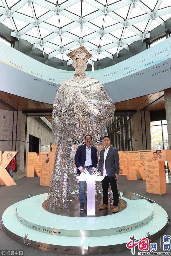 2018年11月4日,江苏苏州,装置艺术家、沈阳大学美术学院院长解勇教授用文字打造的国内最高装置艺术作品“学习铸造人生”亮相。解勇(画面右)与俞敏洪在作品前合影。