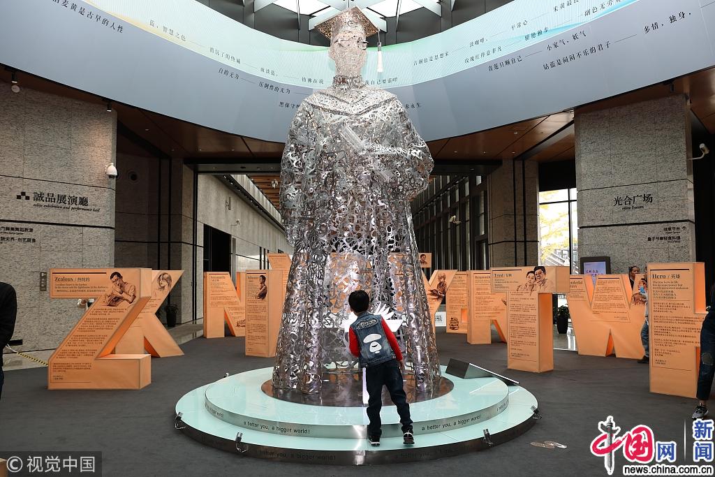 2018年11月4日,江苏苏州,装置艺术家、沈阳大学美术学院院长解勇教授用文字打造的国内最高装置艺术作品“学习铸造人生”亮相。