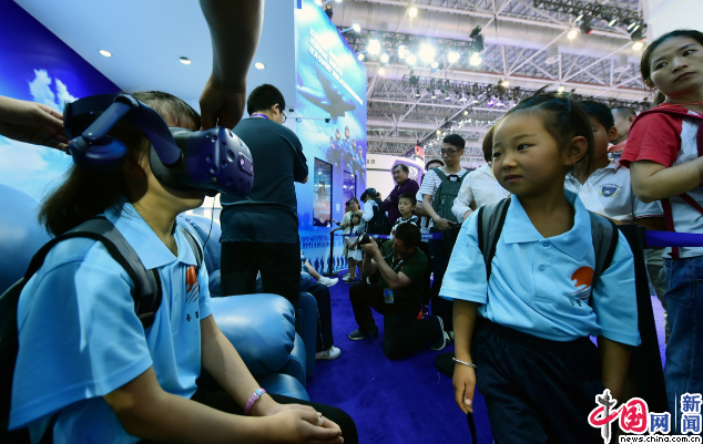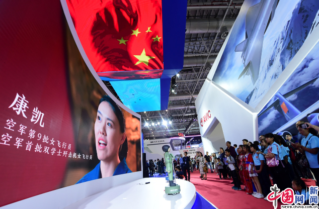 在博览会的空军招飞展区,孩子们簇拥在大屏幕前,聚精会神地观看介绍空军发展史的影像,从早期的空军战斗英雄,到中国首位女航天员刘洋,那身帅气的蓝色军装在孩子们的心中留下深刻的印记。