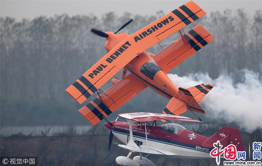 2018年11月16日,武汉,2018RENO国际航空锦标赛首日,澳大利亚野马特技飞行表演队在领飞保罗·贝纳特的带领下,进行三机编队特技飞行表演。周国强/视觉中国