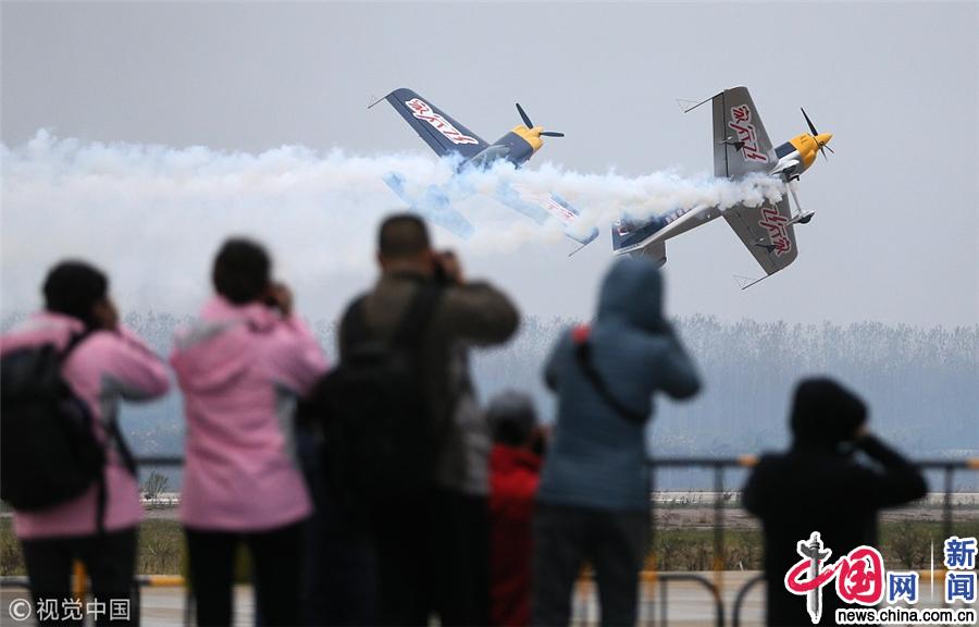 2018年11月16日,武汉,2018RENO国际航空锦标赛首日,澳大利亚野马特技飞行表演队在领飞保罗·贝纳特的带领下,进行三机编队特技飞行表演。周国强/视觉中国