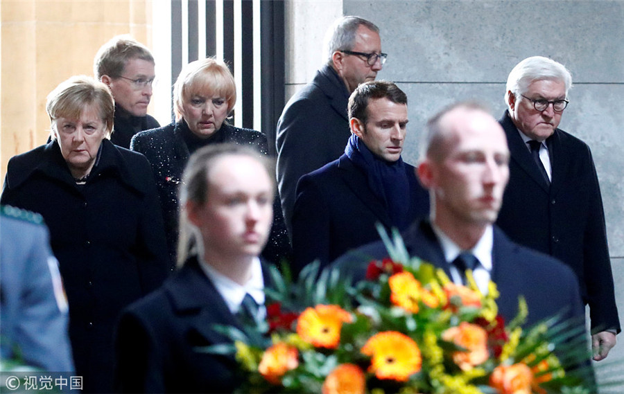 当地时间2018年11月18日,德国柏林,德国总理默克尔、德国总统施泰因迈尔、法国总统马克龙在新岗亭德国联邦中央纪念馆出席敬献花圈仪式。AXEL SCHMIDT/视觉中国