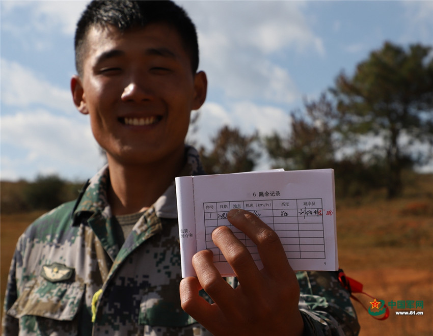 伞降实跳后一名特战队员展示自己的跳伞记录本。