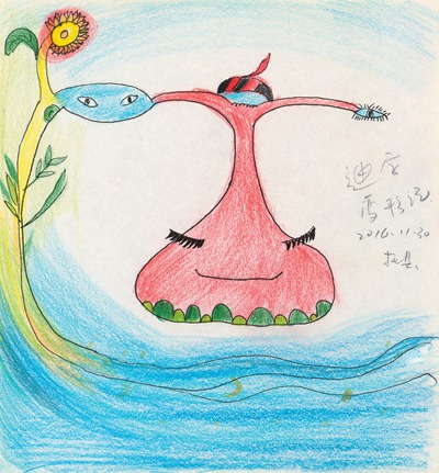 吴迪最近画的一张没有展出的画,主角是院里的刘阿姨。“我觉得刘阿姨是一只飞来飞去的蝴蝶,护理员像个扑蝶高手,也要飞来飞去地守护蝴蝶。”