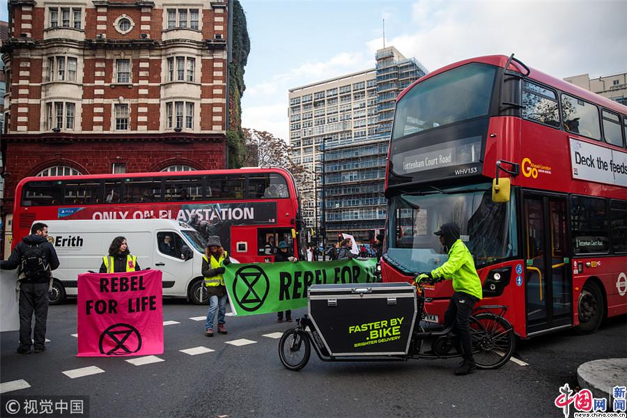 当地时间2018年11月21日,英国伦敦,环保活动家封堵道路示威,呼吁政府更好地应对气候变化。Jack Taylor/视觉中国