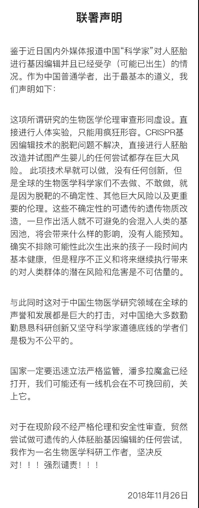 “基因编辑婴儿”一事宣布后便立刻引来多方质疑,当晚,122位中国学者通过@知识分子官方微博发布“科学家联合声明”:“对于在现阶段不经严格伦理和安全性审查,贸然尝试做可遗传的人体胚胎基因编辑的任何尝试,我们作为生物医学科研工作者,坚决反对!!!强烈谴责!!!”