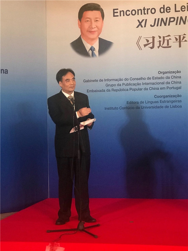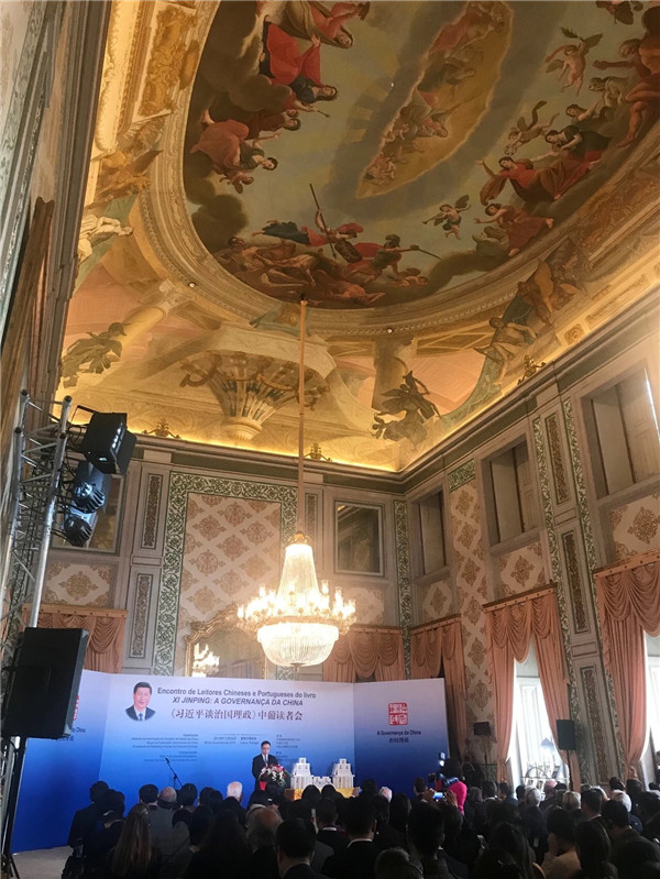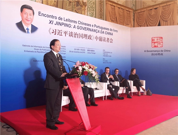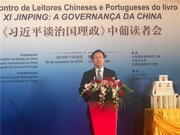 国家主席习近平对葡萄牙进行国事访问前夕,由中国国务院新闻办公室、中国外文局、中国驻葡萄牙大使馆等共同举办的《习近平谈治国理政》中葡读者会于当地时间11月26日在葡萄牙首都里斯本举行。