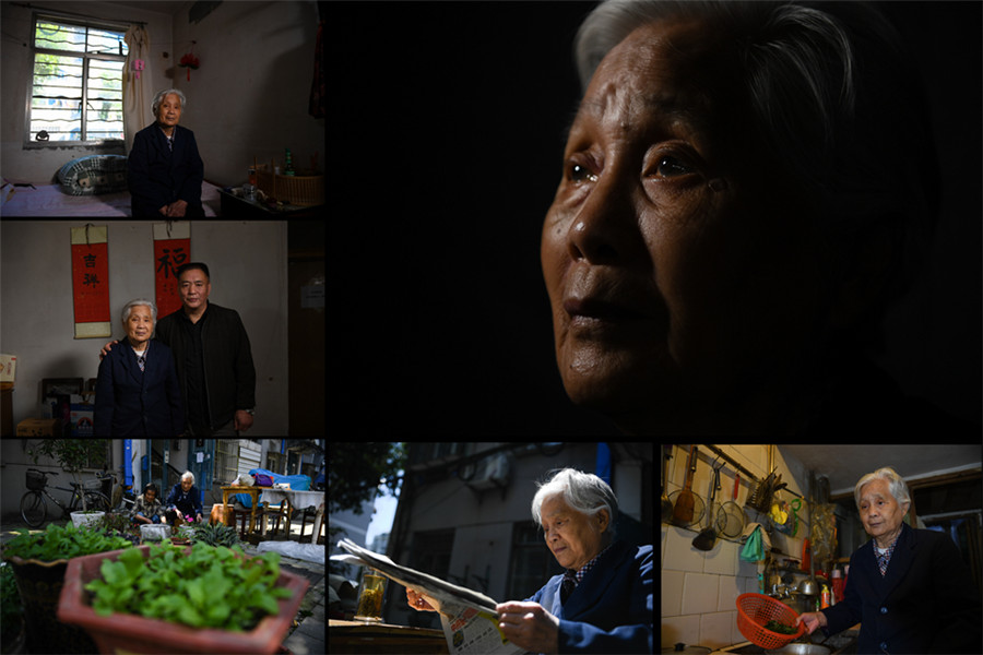 右上:伍秀英肖像;左上:伍秀英在南京家中;左中:伍秀英与二儿子罗嗣俊(右)在家中合影;左下:伍秀英(右)在种养绿植;下中:伍秀英在楼下喝茶看报;下右:伍秀英在自家厨房忙碌(拼版照片,2018年5月9日摄)。