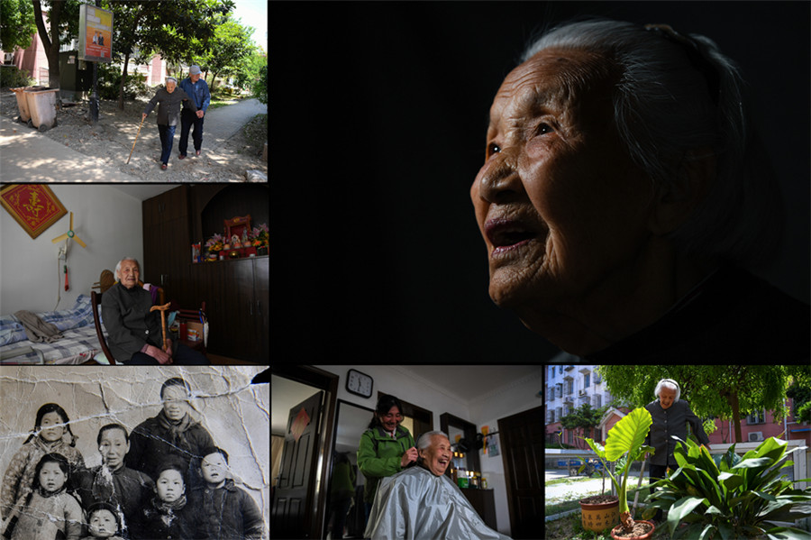 右上:黄刘氏肖像;左上:黄刘氏在儿子黄才荣的搀扶下在小区散步;左中:黄刘氏在南京家中;左下:黄刘氏(后排右)、黄刘氏母亲(后中)、黄刘氏儿子黄才荣(前排右二)的老照片(翻拍照片);下中:护工给黄刘氏梳理头发;下右:黄刘氏在小区里侍弄花草(拼版照片,2018年4月19日摄)。