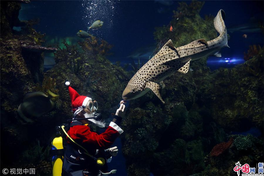 鱼儿也过圣诞节 马耳他潜水员扮圣诞老人水下喂鱼
