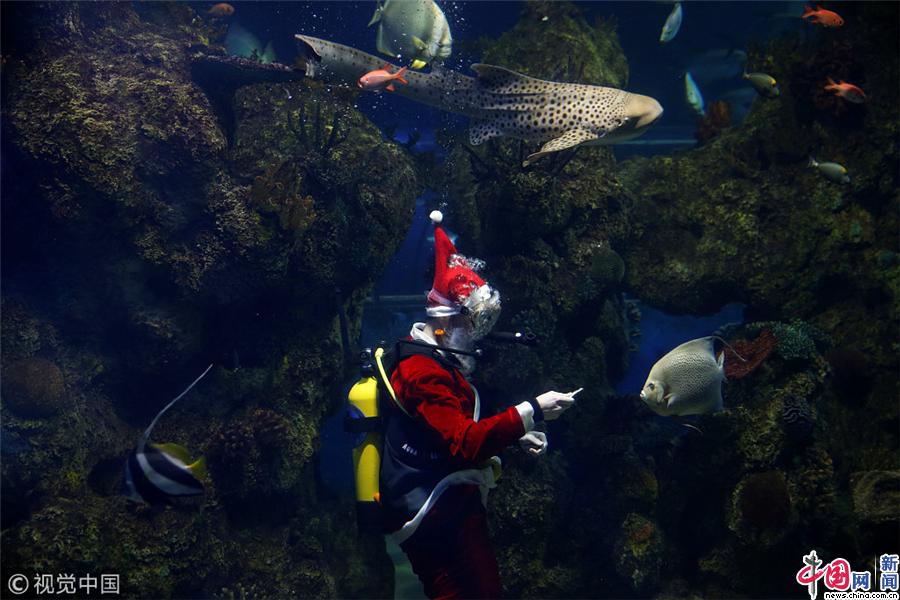 鱼儿也过圣诞节 马耳他潜水员扮圣诞老人水下喂鱼