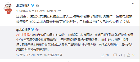 13日,“北京消防”官方微博发布通报:经调查,该起火灾原因系物业工作人员对冷却塔进行检修时误操作,造成电加热棒干烧引燃冷却塔内隔音棉等可燃物所致,目前事故责任人已被公安机关控制。