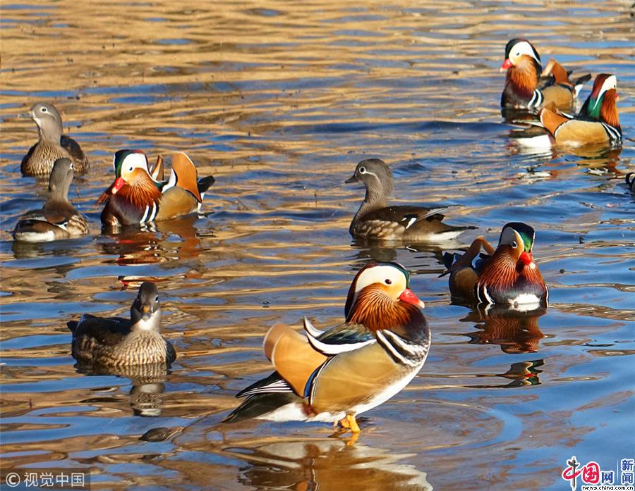北京:鸳鸯冬日扎堆玉渊潭 戏水觅食萌态十足